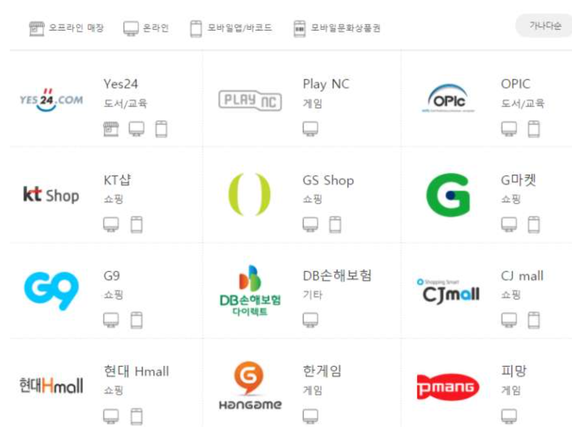 온라인에서도 약 1천여개의 사이트에서 사용이 가능합니다. 대표적인 제휴처는 다음과 같습니다.