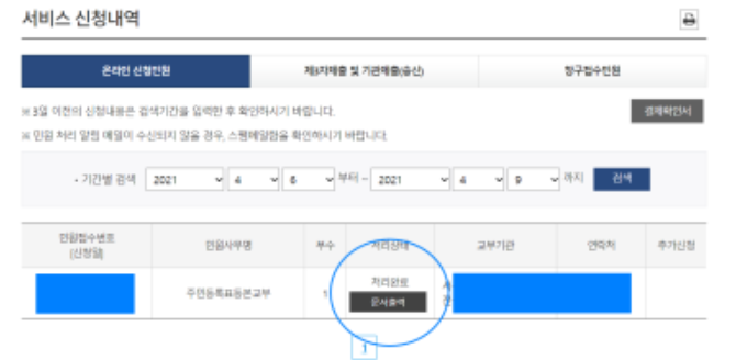 6. 그럼 신청내역 페이지로 넘어옵니다. 여기서 문서출력을 클릭하면 주민등록등본 인터넷발급 완료!