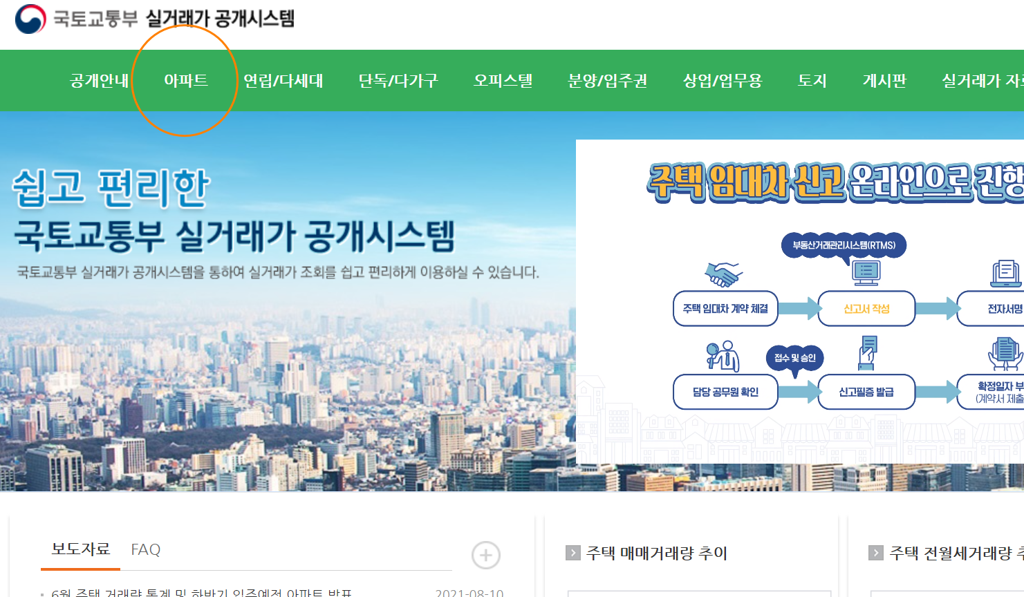 2. 메인화면 상단 메뉴 중 아파트를 클릭합니다.